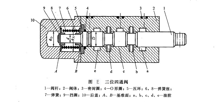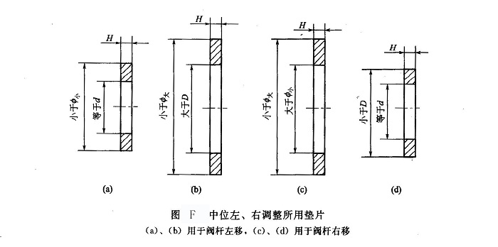 ②方法Ⅱ 若認(rèn)為采用方法I不便,可采用加圓墊片的方法確定閥桿倒角的準(zhǔn)確位置(見圖F)。預(yù)先加工出厚度分別為0.5mm和0.8mm的兩組圓墊片,每組一大一小共兩個(gè),大墊片用來移動(dòng)閥桿,小墊片用來防止閥桿竄動(dòng)。用于左移的大墊片內(nèi)徑略大于閥桿直徑D,外徑略小于或等于圖E中后蓋10的內(nèi)徑廬大;小墊片外徑略小于圖F中后蓋10的里端內(nèi)徑聲小,內(nèi)徑等于或略大于閥桿前端直徑d。如欲將閥桿中立位置左移,就將大墊片墊在彈簧座B基準(zhǔn)面后面,小墊片墊在彈簧座基準(zhǔn)面A后面(這樣,閥桿的中立位置就會(huì)左移,而閥桿仍能保持左右沒有自由竄動(dòng)量,如果只墊大墊片,閥桿就會(huì)有自由竄動(dòng)量);如欲將閥桿向右移動(dòng),就將大墊片墊在彈簧座基準(zhǔn)面A后面,將小墊片墊在彈簧座基準(zhǔn)面B后面,這樣,閥桿的中立位置就會(huì)向右移動(dòng)。每次加裝墊片后(左、右移動(dòng)各有2種厚度的墊片,共有4種狀態(tài))均須裝機(jī)試驗(yàn),最多4次就能找出閥桿上油槽阻礙低壓回油處(對(duì)應(yīng)a腔或b腔);然后,對(duì)阻擋回油的軸肩處進(jìn)行如同方法工那樣的倒角處理即可,但倒角后切不可忘記將所加的墊片取下來;如果加墊片后,閥桿的動(dòng)作正常,可暫時(shí)使用。