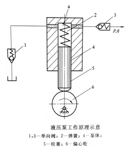 增大,形成局部真空,油箱中的油液在大氣壓的作用下,頂開單向閥1進入a中,實現(xiàn)吸油。當偏心向上轉(zhuǎn)時,推動柱塞向上移動,容積a逐漸減小,油液受擠壓而產(chǎn)生壓力,使單向閥1關閉,油液頂開單向閥3而輸入系統(tǒng),實現(xiàn)壓油。這樣液壓泵就將原動機輸入的機械能轉(zhuǎn)換為液體的壓力能。偏心輪連續(xù)轉(zhuǎn)動,液壓泵不斷地吸油和壓油,也就不斷地向系統(tǒng)供油。由上可知,液壓泵是通過密閉容積作周期性的變化來完成吸油和排油工作的,其輸出油量的多少取決于柱塞往復運動的次數(shù)和密封容積變化的大小。這種依靠密封工作容積的變化,將機械能轉(zhuǎn)換為壓力能的泵,稱為容積式液壓泵。