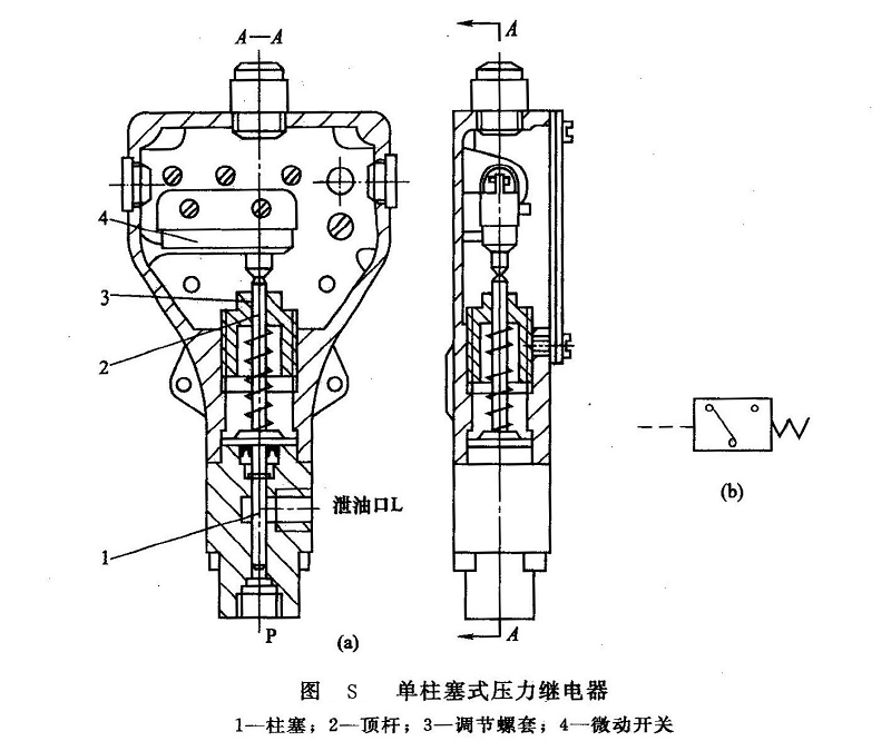 結(jié)構(gòu)與工作原理 圖S所示為單柱塞式壓力繼電器的結(jié)構(gòu)及其職能符號。控制口P和液壓系統(tǒng)相連,當(dāng)系統(tǒng)壓力達(dá)到調(diào)定值時(shí),作用于柱塞1上的液壓力克服彈簧力,頂桿2上推,使微動(dòng)開關(guān)4的觸點(diǎn)閉合,發(fā)出電信號;當(dāng)系統(tǒng)壓力下降,彈簧力將柱塞下推,使微動(dòng)開關(guān)的觸點(diǎn)斷開,電信號消失。