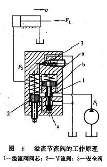 圖H所示為溢流節(jié)流閥的工作原理。來自液壓泵壓力為p1的油液,進(jìn)入閥后,一部分經(jīng)節(jié)流閥2(壓力降為p2)進(jìn)入執(zhí)行元件(液壓缸),另一部分經(jīng)溢流閥閥芯1。的溢油口流回油箱。溢流閥閥芯上腔a和節(jié)流閥出口相通,壓力為p2;溢流閥閥芯大臺(tái)肩下面的油腔b、油腔c和節(jié)流閥入口的油液相通,壓力為p1。當(dāng)負(fù)載FL增大時(shí),出口壓力p2增大,因而溢流閥閥芯上腔a的壓力增大,閥芯下移,關(guān)小溢流口,使節(jié)流閥入口壓力p1增大,因而節(jié)流閥前后壓差 (p1-p2)基本保持不變;反之亦然。