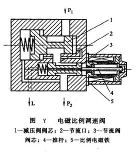 圖Y所示為電磁比例調速閥結構。它是在普通調速閥的基礎上,采用比例電磁鐵取代節(jié)流閥或調速閥的手調裝置,以輸入電信號控制節(jié)流口開度,便可連續(xù)地或按