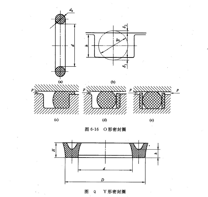O形密封圈的結(jié)構(gòu)和工作情況如圖P所示。圖P(a)為其外形;圖P(b)為裝入密封溝槽的情形,δ1、δ2為O形圈裝配后的預壓縮量,通常用壓縮率W表示,W=[(d0-h)/d0]×100%。對于固定密封、往復運動密封和回轉(zhuǎn)運動密封,應分別達到15%~20%、10%~20%、5%~10%,才能取得好的密封效果。當液壓油工作壓力超過10MPa時, O形圈在往復運動中容易被油液壓力擠入間隙而提早損壞,如圖P(c)所示,因此要在它的側(cè)面安放1.2~1.5mm厚的聚四氟乙烯擋圈,單向受力時在受力側(cè)的對面安放一個擋圈,如圖P(d)所示;雙向受力時則在兩側(cè)各放一個擋圈,如圖P(e)所示。