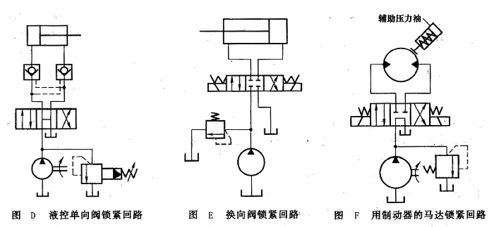 圖E所示為換向閥鎖緊回路。它是利用三位四通換向閥的中位機能(O型或M型)使活塞在行程范圍內的任意位置上停止運動并鎖緊。但由于滑閥式換向閥的泄