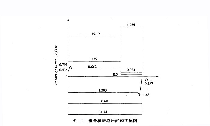 根據(jù)上述D與d的值,可以估算液壓缸在不同工作階段的壓力、流量和功率(見下表),并據(jù)此繪出如圖D所示的液壓缸工況圖,其中粗實線、細實線和雙點畫線分別表示P、q、p。