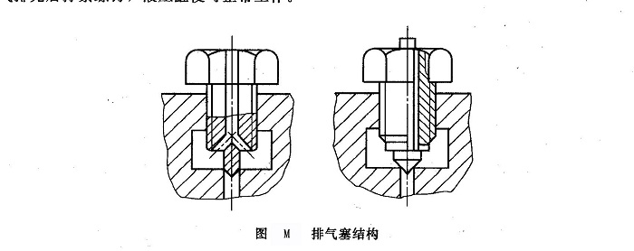 對(duì)于要求不高的液壓缸,往往不設(shè)專門的排氣裝置,而是將油口布置在缸體兩端的最高處,由流出的液壓油將缸中的空氣帶走;對(duì)于速度穩(wěn)定性要求較高的液壓缸和大型液壓缸,常在液壓缸的最高處設(shè)置專門的排氣裝置,如排氣塞、排氣閥等。圖M所示為排氣塞,當(dāng)松開排氣塞螺釘時(shí),讓液壓缸全行程空載往復(fù)運(yùn)動(dòng)若干次,帶有氣泡的油液就會(huì)排出,空氣排完后擰緊螺釘,液壓缸便可正常工作。