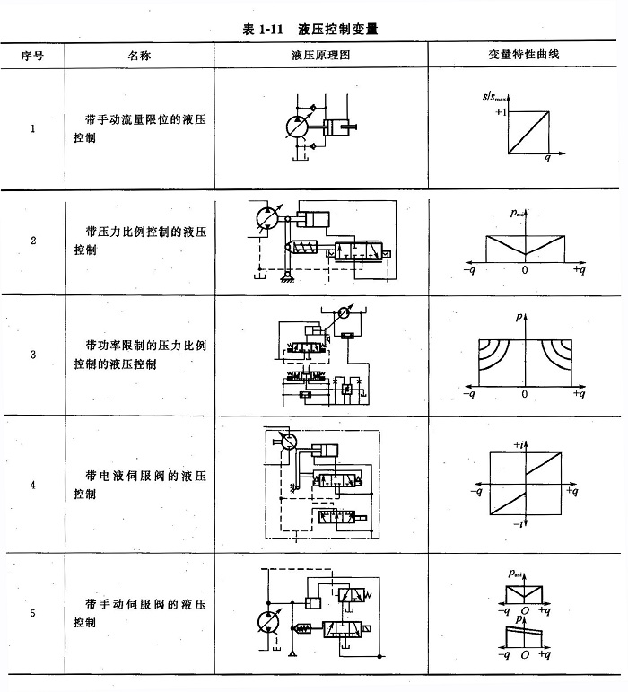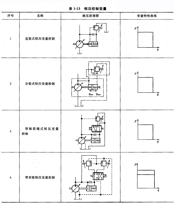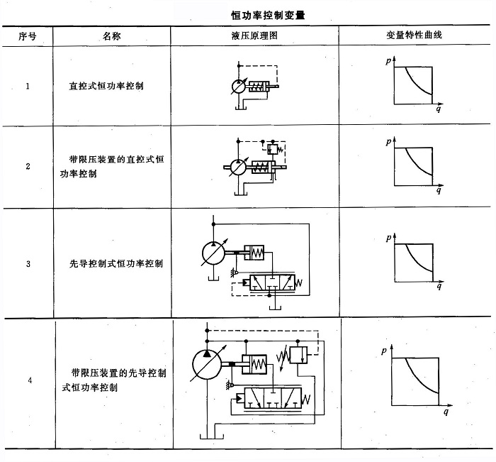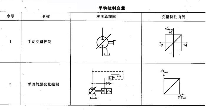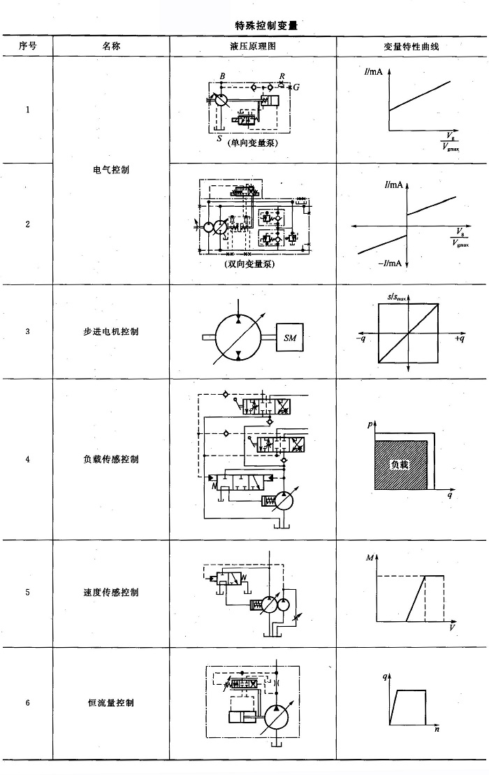 (2)變量控制方式及其特性 通過改變液壓泵的排量V(幾何參數(shù))調(diào)節(jié)流量時,在泵的轉(zhuǎn)速恒定時,泵的排出流量發(fā)生變化,可形成流量控制泵。由于泵的出口總有阻力負(fù)載存在,故泵出口流量的變化將影響泵的出口壓力。有時控制泵的排量還能控制泵的工作壓力,形成壓力控制變量泵??梢娮兞靠刂品绞椒N類繁多。工程實(shí)際中,軸向柱塞泵在結(jié)構(gòu)上最適宜安裝各種變量控制機(jī)構(gòu),故變量控制方式最多。葉片泵也可安裝若干變量控制機(jī)構(gòu)。一些典型的變量控制方式見下表。