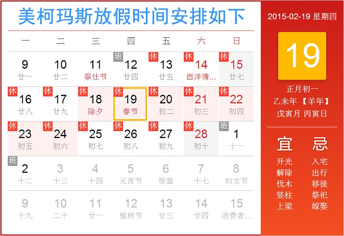 根據(jù)國(guó)務(wù)院辦公廳關(guān)于2015年春節(jié)放假安排時(shí)間的通知,并結(jié)合公司的實(shí)際情況,經(jīng)研究決定,美柯瑪斯2015年春節(jié)放假安排相關(guān)事宜作如下安排: