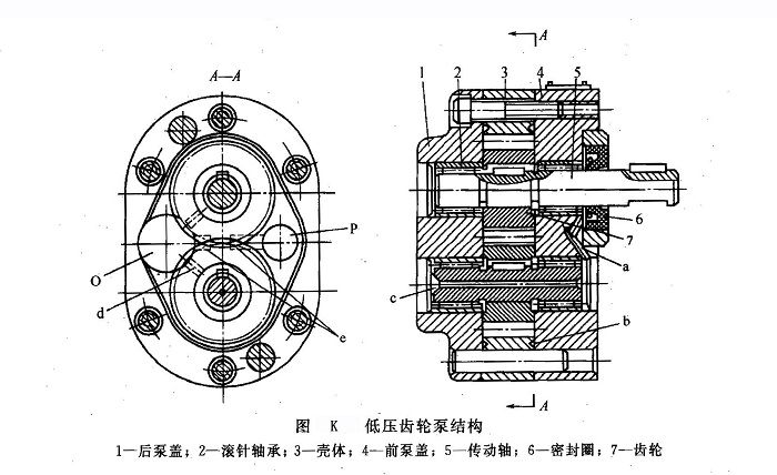 ①低壓齒輪泵 該泵為泵蓋一殼體一泵蓋三片式結(jié)構(gòu)(圖K)。裝在殼體3中的一對齒輪由傳動軸5驅(qū)動。在殼體3的左右斷面各銑有卸荷槽b,經(jīng)殼體端面泄漏的油液經(jīng)卸荷槽b流回吸油腔,以降低殼體與端蓋結(jié)合面上的油壓對軸承造成的軸向推力,減小螺釘載荷。在泵前、后端蓋上的困油卸荷槽e可消除泵工作時的困油問題。孔道a、c、d可將軸向泄漏并潤滑軸承的油液送回到吸油腔,使傳動軸的密封圈6處于低壓,因而不必設(shè)置單獨的外泄漏油管。