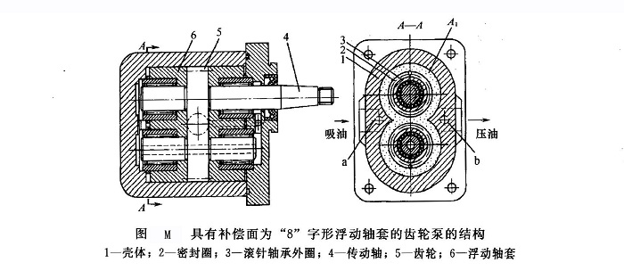 ②高壓齒輪泵 圖M所示為具有“8”字形浮動軸套的齒輪泵結(jié)構(gòu)。齒輪5由帶圓錐軸伸的傳動軸4驅(qū)動,浮動軸套6的“8’’字形補償面積A1由殼體1和兩個與齒輪同心的密封圈2圍成,壓力油自高壓引油孔b引入并作用在“8”字形補償面積A1上,泄漏油孔a可把內(nèi)部的泄漏油引入吸油腔。在泵啟動或空載而油壓還未建立時,0形密封圈2可以使浮動軸套6與齒輪5間產(chǎn)生足夠的、必要的預(yù)緊接觸力。這種補償裝置結(jié)構(gòu)簡單。但由于補償面積的對稱中心與主、從動齒輪端面對稱中心重合,液壓壓緊力(即補償液壓力的合力)的作用線通過浮動軸套的中心,而軸套另一側(cè)液壓反推力的合力作用線離開軸套中心向壓油腔偏離,這兩個力對軸套就形成了力偶。該力偶易使軸套傾斜,這不僅會加大端面間隙、增加泄漏,還會使軸套浮動不靈活及產(chǎn)生局部磨損。為了克服上述缺點,通常要加大軸套與殼體的配合長度并提高加工精度。