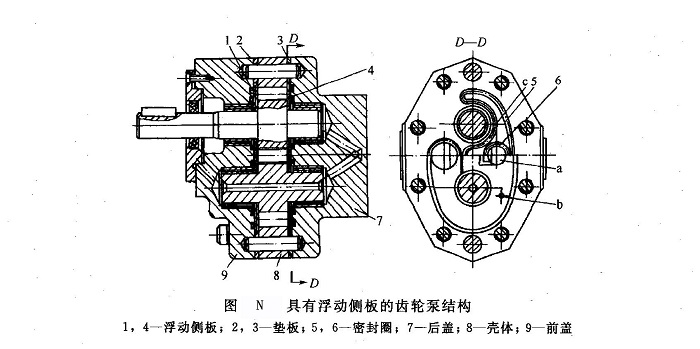 圖N所示為采用浮動側(cè)板實現(xiàn)軸向間隙自動補償?shù)母邏糊X輪泵結(jié)構(gòu)。該泵在殼體8與前蓋9、后蓋7之間增設(shè)了墊板2和3、浮動側(cè)板1和4(墊板比浮動側(cè)板厚0.2mm)以及密封圈5和6(嵌在泵蓋內(nèi)側(cè)排油區(qū)位置)。工作時,壓油區(qū)的一部分壓力油通過浮動側(cè)板上的兩個小孔b作用在密封圈5和6包圍的區(qū)域內(nèi),反向推動浮動側(cè)板向內(nèi)微量移動,從而使軸向間隙保持在0.03~0.04mm之間。這樣可控制700%~80%以上的泄漏量。故此類泵容積效率較高,適用于高壓齒輪泵。國產(chǎn)CB-FX系列中高壓齒輪泵即屬于此類泵,其額定壓力達(dá)到20MPa。