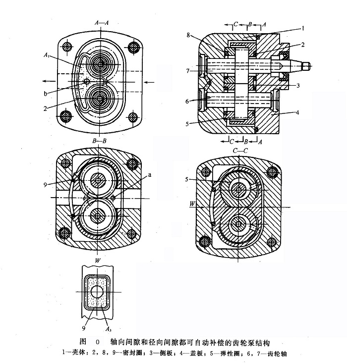 圖O所示為軸向間隙和徑向間隙都可以自動補償?shù)凝X輪泵結(jié)構(gòu)。齒輪軸6和7的左端在殼體1內(nèi),右端在蓋板4內(nèi)。殼體中裝有一塊可軸向浮動的側(cè)板3,其作用與端面間隙補償中浮動軸套相似,殼體內(nèi)部結(jié)構(gòu)和形狀可以使軸向間隙和徑向間隙同時得到補償。側(cè)板的軸孔和齒輪軸之間以及殼體的深度和側(cè)板寬度之間都有較大間隙,足以使側(cè)板軸向浮動和徑向浮動。在側(cè)板的外端面上,有一個特殊形狀的橡膠密封圈2嵌入相配的凹槽里(見剖視圖A-A)。該密封圈確定了補償面積A1,泵的壓油腔的高壓油經(jīng)高壓引油孔b引入并作用在面積A1上。面積A1的形狀和大小使壓緊力與反推力平衡,同時保證軸向間隙為最佳值。徑向間隙補償在角Φ范圍內(nèi)起作用(見剖視圖B-B)。吸油壓力作用在齒輪圓周的其余部分;壓油腔的壓力作用在由齒輪的扇形角Φ和齒輪寬度決定的側(cè)板內(nèi)表面,這個力把齒輪向吸油腔方向壓到軸承間隙的極限,同時將側(cè)板向壓油腔方向推動。從外面作用到側(cè)板上的力(工作壓力×面積A3)將側(cè)板向吸油腔方向推動,所以徑向磨損后能夠在Φ角范圍內(nèi)自動補償。受密封圈9限制的補償面積A3,設(shè)計為在一定工作壓力下,它所產(chǎn)生的力能與反推力平衡并保持最佳間隙。在殼體底部,角度西范圍內(nèi)的密封由兩個特制的彈性圈5來保證(見剖視圖C-C)。側(cè)板對齒輪的預(yù)壓緊力,在徑向上由橡膠密封圈9產(chǎn)生,在軸向上由密封圈2和8產(chǎn)生。內(nèi)部泄漏油通過軸孔,再經(jīng)泄漏油孔A引入吸油腔。由于兩種間隙都能補償?shù)阶罴阎?,故這種結(jié)構(gòu)形式的齒輪泵可用于更高的工作壓力。