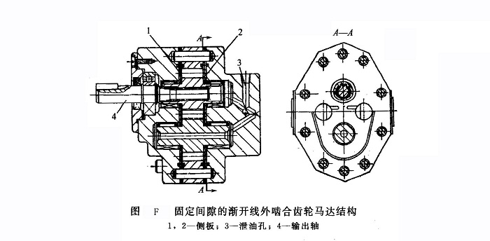 ①固定間隙的漸開(kāi)線外嚙合齒輪馬達(dá) 圖F所示為固定間隙的漸開(kāi)線外嚙合齒輪馬達(dá)結(jié)構(gòu)。齒輪兩側(cè)的側(cè)板用優(yōu)質(zhì)碳素鋼08F表面燒結(jié)0.5~0.7mm厚的磷青銅制成。該側(cè)板只起耐磨作用,沒(méi)有端面間隙補(bǔ)償作用。采用固定間隙可以減小摩擦轉(zhuǎn)矩,改善啟動(dòng)性能,但容積效率較低。國(guó)產(chǎn)CM-F型齒輪馬達(dá)即為此種結(jié)構(gòu),其額定壓力為14MPa,排量為11~40mL/r,轉(zhuǎn)矩為20~70N·m,轉(zhuǎn)速為1900~2400r/min。