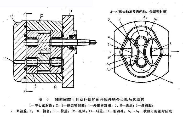 ②軸向間隙可自動(dòng)補(bǔ)償?shù)臐u開(kāi)線外嚙合齒輪馬達(dá) 圖G所示為軸向間隙可自動(dòng)補(bǔ)償?shù)臐u開(kāi)線外嚙合齒輪馬達(dá)結(jié)構(gòu)。在軸套9、10的外端布有密封圈1~4,中心密封圈1包圍兩個(gè)軸承孔,形成一個(gè)中間收縮的“8”字形區(qū)域A1,因區(qū)域A1通過(guò)兩個(gè)軸承與泄油孔14相通,故區(qū)域A1內(nèi)的壓力與泄漏油腔的壓相等。側(cè)邊密封圈2和3對(duì)稱(chēng)布置在密封圈1的兩側(cè)(密封圈2和3各有一段長(zhǎng)度直接與密封圈1接觸),分別形成菱形區(qū)域A2和A3,A2經(jīng)通道5與進(jìn)油腔6相通,A3經(jīng)通道8與回油腔7相通。外圍密封圈4也布置成菱形,包圍著密封圈1、2和3(密封圈4上有兩段長(zhǎng)度分別與密封圈2和3直接接觸),因密封圈2和3的兩側(cè)都分別與密封圈1和4直接接觸,故在密封圈4的包圍圈內(nèi)又形成兩個(gè)區(qū)域A4和A5,由于滲漏和串油的原因,所以A4和A5內(nèi)的壓力很接近于高壓腔壓力。密封圈4夾在殼體12與前蓋11(后蓋13)之間,密封圈1夾在軸套和前蓋(后蓋)之間,而密封圈2和3與密封圈4相接近的部分保持在殼體和前蓋(后蓋)之間。所有密封圈都嵌在前蓋(后蓋)的凹槽中。各密封圈之間互相接近的部分,用直接接觸的辦法,可以簡(jiǎn)化加工和裝配工藝,降低成本。