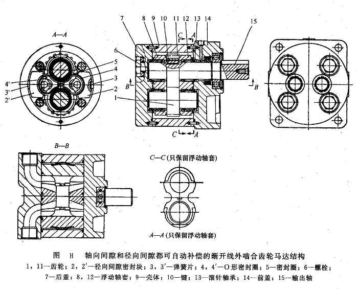 a.由于馬達(dá)齒數(shù)較多,徑向間隙密封塊與齒輪又只有兩個(gè)齒接觸,過(guò)渡區(qū)很小(只有一個(gè)齒間),再使過(guò)渡區(qū)圓弧長(zhǎng)度盡可能靠近節(jié)點(diǎn),所以就將低壓區(qū)的包角口限制在極小的范圍內(nèi),并在密封塊、軸套與前蓋(后蓋)之間用O形密封圈加以限制和密封,而其余部分均處于高壓之中,因而可將軸套與齒輪間的摩擦面設(shè)計(jì)得很小(將軸套挖掉部分,見(jiàn)圖H)。這樣,在軸向和徑向,都減小了摩擦面,提高了機(jī)械效率和輸出轉(zhuǎn)矩,改善了啟動(dòng)性能。