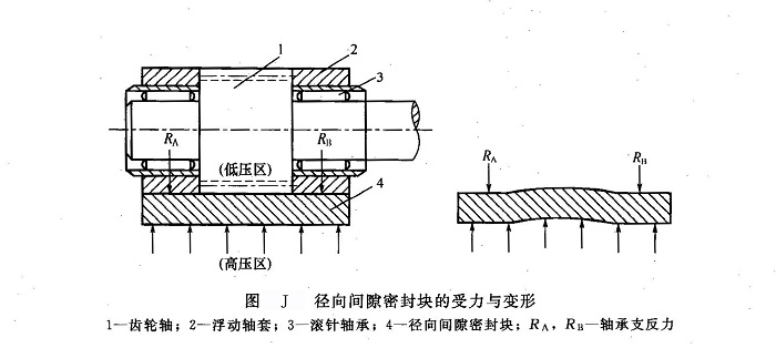f.-般齒輪馬達(dá)的齒頂間隙,是由齒輪軸、軸套、軸承間隙和殼體孔的制造精度及中心距安裝誤差等多種因素決定的,而這種間隙是很難控制的。而使用了徑向間隙密封塊的齒輪馬達(dá)就克服了上述缺點(diǎn),由于徑向間隙密封塊在殼體中是浮動(dòng)的,靠油壓力壓緊在浮動(dòng)軸套(圖I)和齒輪外圓上,因此齒頂?shù)拈g隙只由齒輪頂圓浮動(dòng)軸套和滾針軸承的間隙所決定,這是比較容易控制的。這樣,就可得到最佳間隙值,當(dāng)密封塊磨損后可在油壓力作用下自動(dòng)補(bǔ)償,從而取得了較高的容積效率,也相應(yīng)地提高了啟動(dòng)轉(zhuǎn)矩和低速性能。