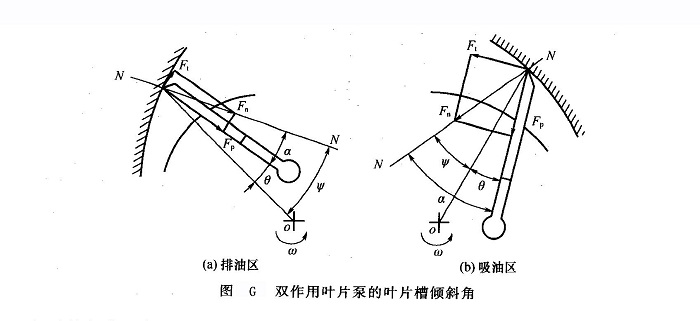 e.葉片前傾安放 當(dāng)葉片在壓油區(qū)沿定子曲線(xiàn)滑動(dòng)時(shí),定子內(nèi)表面對(duì)葉片的法向接觸反力Fn可分解為沿葉片槽方向的分力Fp和橫向分力Ft,由于葉片的外伸部分是懸臂梁結(jié)構(gòu),故橫向分力會(huì)在葉片與槽側(cè)壁的接觸處產(chǎn)生較大的摩擦力,葉片與定子曲線(xiàn)的接觸壓力角α(定子曲線(xiàn)接觸點(diǎn)處的法線(xiàn)方向與葉片方向的夾角)越小,橫向分力Ft=Fnsinα越小,越有利于葉片在其槽內(nèi)自如滑動(dòng),并減小摩擦力從而減少葉片與槽之間的磨損。故葉片槽不徑向開(kāi)設(shè),而是順轉(zhuǎn)向前傾一個(gè)角度θ(通常θ=10°~14°)開(kāi)設(shè),使α<φ,即α=φ-θ[圖G(a)]。否則,壓力角a=φ將較大,Ft也較大。但這樣做的結(jié)論并不適用于吸油區(qū)[圖G(b)],一方面在吸油區(qū)葉片槽前傾反而使壓力角α增大,變?yōu)棣?span lang="EN-US">=φ+θ,使葉片的受力情況更加惡化;另一方面葉片沿定子曲線(xiàn)滑動(dòng)時(shí),其頂部實(shí)際上除了受到定子內(nèi)表面反作用力外,還受到與滑動(dòng)方向相反的摩擦力Ff作用,兩者的合力F才是計(jì)算有害橫向分力Ft的依據(jù),故上述僅以法向接觸反力Fn作為依據(jù)勢(shì)必得出壓力角越小越好的錯(cuò)誤結(jié)論。新的觀點(diǎn)認(rèn)為取θ=0°更為合理,目前國(guó)外一些雙作用葉片泵的葉片槽是徑向開(kāi)設(shè)的,所以關(guān)于葉片安放角問(wèn)題仍值得進(jìn)行深入探討。