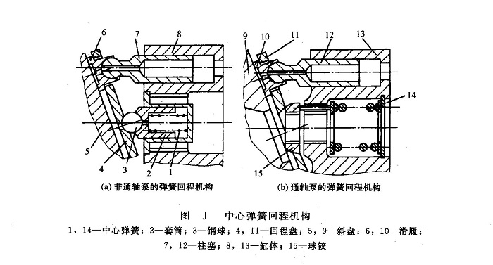 點接觸式泵的柱塞靠分散布置在每個柱塞底部的彈簧使柱塞外伸(回程),靠斜盤作用縮回,自吸能力較差,而且因彈簧高頻工作極易引起疲勞破壞,故此種結(jié)構(gòu)已很少采用。通常軸向柱塞泵采用圖J所示的中心彈簧回程機構(gòu),中心彈簧1的彈簧力通過套筒、鋼球或球鉸、回程盤帶動滑履和柱塞回程,而靠斜盤強迫縮回,自吸能力較強,而且在這種結(jié)構(gòu)中,彈簧承受靜載荷,其壓縮量不隨泵主動軸的轉(zhuǎn)動而變,故彈簧不會產(chǎn)生疲勞破壞。目前,這種結(jié)構(gòu)在軸向柱塞泵中被廣泛采用。