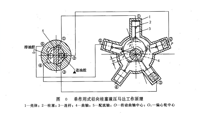 (1)單作用式徑向柱塞馬達的工作原理 如圖O所示,曲軸連桿式徑向柱塞馬達沿殼體1的圓周放射狀均勻布置了五個(或七個)缸,缸中的柱塞2通過球鉸與連桿3相連接,連桿端部與曲軸4的偏心輪(偏心輪的圓心為O1,曲軸旋轉中心為O,兩者的偏心距為e)相接觸,曲軸的一端為輸出軸,另一端則通過十字聯(lián)軸器與配流軸5連接。配流軸上“隔墻”兩側分別為進油腔和排油腔。