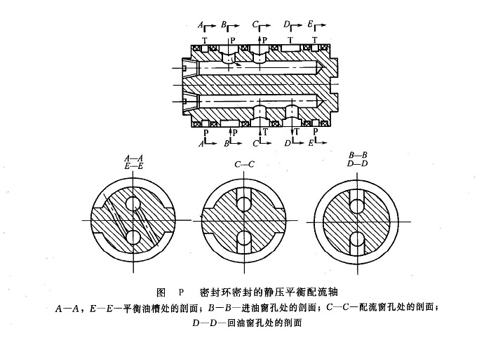③配流副 圖O所示馬達為軸配流。由于配流軸的一側為高壓腔,另一側為低壓腔,故配流軸工作過程受到很大的徑向力,此徑向力將配流軸推向一側,而使另一側間隙加大,造成滑動表面的磨損和泄漏量的增加,致使效率下降。為此,常采取開設對稱平衡油槽的措施以平衡徑向力。如圖P所示為采用密封環(huán)密封的靜壓平衡配流軸,正中的C-C窗孔是配流窗孔,B-B和D-D上的環(huán)形槽分別是進油和回油窗孔,A-A和E-E是靜壓平衡半圓環(huán)形槽。假定各密封環(huán)分別放置在密封帶的正中。若進、出油方向如圖P中箭頭所示,各孔標有符號P的都是高壓腔,標有符號T的都是低壓腔??梢姡?/span> B-B和D-D圓周方向的壓力都相同,沒有徑向力產(chǎn)生;C-C窗孔剖面的上腔與進油口相通,是高壓側,下腔與回油口相通,是低壓側,因此使配流軸受到很大的徑向力。為了平衡這個徑向力,在配流軸兩端設置半圓環(huán)形平衡油槽A-A和E-E,使其上腔通高壓油,為了減小泄漏,各腔之間設有密封環(huán)。為了保證上、下兩側靜壓平衡,配油窗口和平衡油槽的相關尺寸應滿足如下關系式: