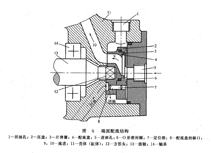 圖Q所示為曲軸連桿液壓馬達的端面配流結構。曲軸13通過方形頭12帶動配流盤4與壓盤2同步旋轉,轉動中實現(xiàn)配流。啟動或空載運轉時靠片彈簧(碟形彈簧)3使配流盤和壓盤貼緊缸體11與端蓋,設計時保證貼緊力大于配流盤與缸體間的分離力,工作時由液壓實現(xiàn)貼緊。但這一結構因分離力與貼緊力不重合而使配流盤存在傾側力矩。通過采用靜壓平衡結構設計,可使端面配流副實現(xiàn)理論上完全平衡。