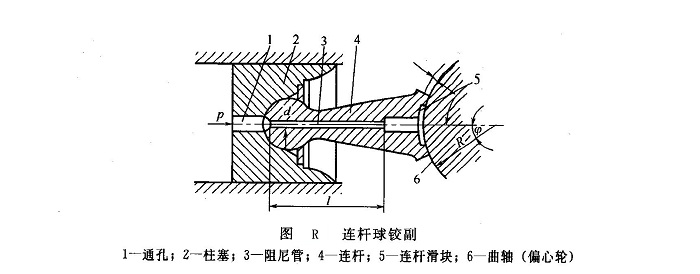 ④連桿副 除了配流副外,曲軸連桿液壓馬達的性能在很大程度上取決于連桿運動副。連桿球鉸副的典型結構如圖R所示。它由連桿4的球頭與柱塞2的球窩,連桿滑塊5的底部與曲軸(偏心輪)6兩對摩擦副組成。連桿滑塊底部與曲軸(偏心輪)間早期為金屬接觸,滑塊底部澆鑄耐磨合金,以減小摩擦力。有的馬達曲軸(偏心輪)上裝有滾子軸承,用滾動摩擦替代滑塊底部與偏心輪間的滑動摩擦;目前多數(shù)馬達在該處設計成靜壓平衡或靜壓支承?;瑝K底部設置油室,壓力油通過連桿中心阻尼器進入底部油室。工作中滑塊不浮起,油室中液體壓力平衡大部分柱塞推力,并使摩擦副得到良好潤滑。