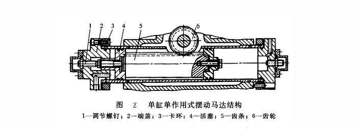 ①單缸單作用式擺動馬達(dá)(圖Z) 在單缸單作用式擺動馬達(dá)中,作活塞桿用的齒條5和齒輪6嚙合作為機械轉(zhuǎn)換器。當(dāng)輸入壓力油時,活塞4推動齒條作直線移動,經(jīng)齒輪將直線移動轉(zhuǎn)換為旋轉(zhuǎn)運動,由齒輪軸輸出轉(zhuǎn)矩?;钊谐碳摧敵鲛D(zhuǎn)角大小的控制可通過螺釘1調(diào)節(jié)。這種擺動馬達(dá)的優(yōu)點是結(jié)構(gòu)簡單,位置精度便于控制,應(yīng)用廣泛。