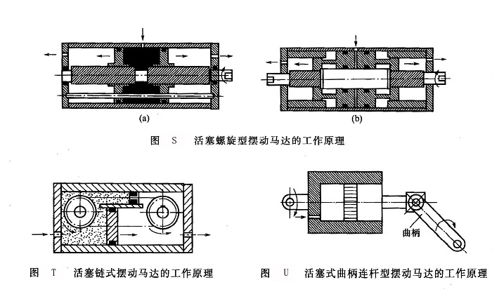(3)活塞螺旋型擺動馬達(dá) 圖S(a)所示為一種活塞螺旋型擺動馬達(dá)的工作原理,活塞與螺桿組成螺旋副,螺桿的左、右兩半分別為右旋和左旋螺紋,各自與左、右兩個(gè)活塞旋合。當(dāng)壓力油從兩個(gè)活塞中間通入時(shí),兩活塞各自向相反的方向運(yùn)動,共同帶動螺桿轉(zhuǎn)動,輸出轉(zhuǎn)矩。若壓力油反向時(shí),螺桿反向旋轉(zhuǎn)。輸出轉(zhuǎn)矩大,螺桿上不受軸向力。但行程短,轉(zhuǎn)角小,螺旋處泄漏較大,只能用于低壓。圖S(b)所示為另一種活塞螺旋型擺動馬達(dá),其原理與圖S(a)所示馬達(dá)相同,但圖S(b)所示馬達(dá)用密封圈將活塞的左右腔隔開,螺旋副處不必另設(shè)密封,故內(nèi)泄漏大為減少,可用于高壓。