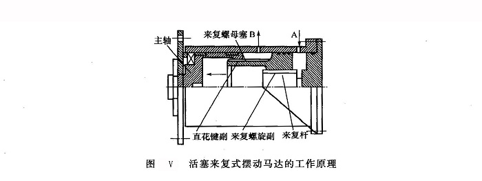 (6)活塞來復(fù)式擺動馬達(dá)如圖V所示,在活塞來復(fù)式擺動馬達(dá)中,當(dāng)壓力油從A口進(jìn)入推動活塞向左作直線運(yùn)動時(shí),B口排油。圖V中主軸固定,通過來復(fù)螺旋副迫使來復(fù)桿及與之固接的缸體旋轉(zhuǎn)。若B口進(jìn)油,A口排油,則缸體反轉(zhuǎn)。馬達(dá)轉(zhuǎn)角的大小取決于活塞行程。此種馬達(dá)的優(yōu)點(diǎn)是結(jié)構(gòu)緊湊,體積小,工作平穩(wěn)可靠,密封容易。缺點(diǎn)是加工成本較高。
