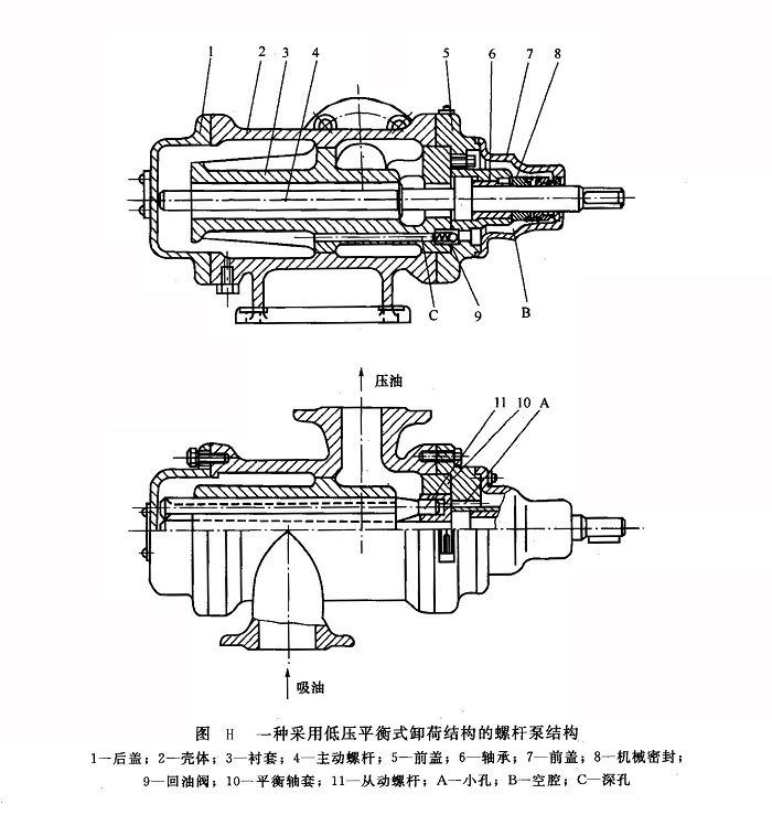 圖H所示為采用低壓平衡式卸荷結(jié)構(gòu)的螺桿泵結(jié)構(gòu)。處于高壓腔的螺桿平衡活塞的端部腔室經(jīng)小孔A、前蓋7的空腔B、回油閥9、襯套深孔C與低壓腔相通,使螺桿的軸向力得到平衡。其中回油閥9的作用是使平衡活塞的端部腔室及空腔B保持較小的背壓,以免該處和吸油腔一樣處于真空狀態(tài),使該處滑動(dòng)軸承的潤(rùn)滑油膜遭到破壞。