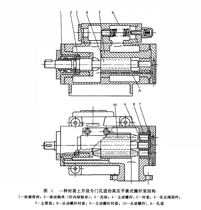 圖G所示為一種襯套上開(kāi)設(shè)專(zhuān)門(mén)孔道的高壓平衡式三螺桿的螺桿泵結(jié)構(gòu)。外套上開(kāi)設(shè)的專(zhuān)門(mén)孔道A將高壓腔的液體引入螺桿底部的平衡活塞處。主動(dòng)螺桿4從高壓腔伸出,通過(guò)徑向球軸承2支承,以承受主動(dòng)螺桿剩余軸向力和固定其位置。在主動(dòng)螺桿高壓端設(shè)有直徑較大的臺(tái)肩,還采用了高壓止推軸承卸荷結(jié)構(gòu)。