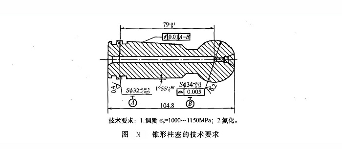 錐形柱塞的加工工藝過程為:下料,鋸切為單件→模鍛成形→調(diào)質(zhì)熱處理→銑兩端面→鉆中心孔→車削成形→粗磨→氮化熱處理→精磨→終驗入庫。