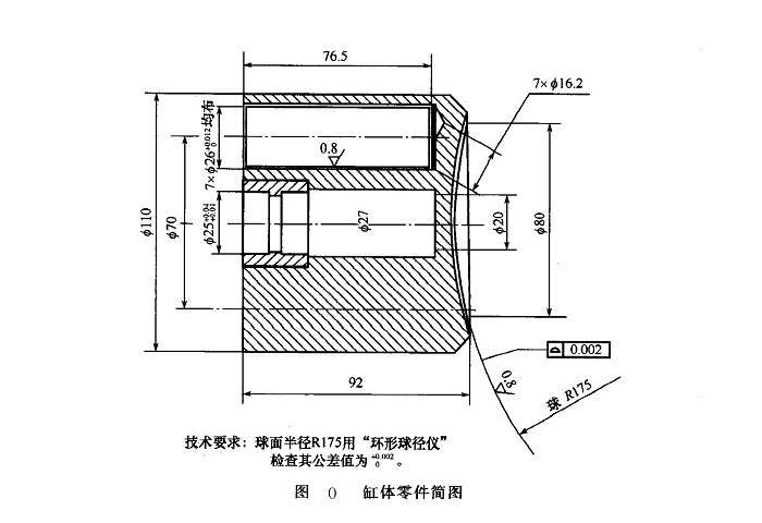 缸體零件簡圖如圖O所示。缸體的典型加工工藝過程為:正火→粗車外圓及中心孔→粗車:仿形車R175球面→鉆七個柱塞孔→雙金屬澆鑄球面→半精車端面外圓→調(diào)頭車端面、基準(zhǔn)外圓及中心孔→擴(kuò)七個柱塞孔→精車:仿形車R175球面→鉆七個斜孔→氣體氮化→壓柱塞銅套及中心軸套→磨外圓→粗鏜七個柱塞孔→精鏜七個柱塞孔→精磨R175球面→清洗去毛刺→終驗入庫。