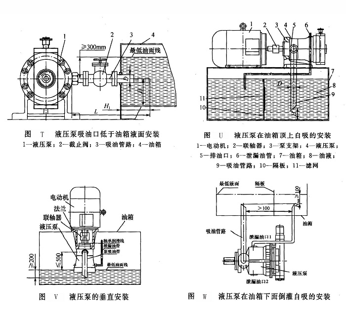 液壓泵安裝時應(yīng)盡可能使其處于油箱液面之下(圖T);對于流量<160L/min的泵,可以裝在油箱上自吸(圖U)。對于流量≥160L/min的柱塞泵,由于原動機功率較大,建議不要安裝在油箱上,而采用倒灌自吸(圖W)。