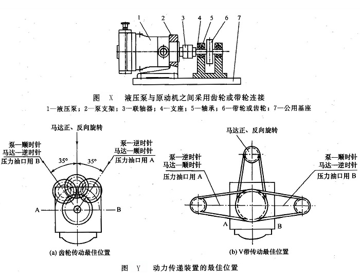若原動機振動較大(如內(nèi)燃機),則液壓泵與原動機之間建議采用帶輪或齒輪進行連接(圖X),應(yīng)加一堆支座來安裝帶輪或齒輪,該支座與泵軸的同軸度誤差應(yīng)不大于Φ0.05mm;泵的安裝支架與原動機的公告基座要有足夠的剛度,以保證運轉(zhuǎn)時始終同軸。齒輪和V帶傳動應(yīng)采用圖Y所示的最佳位置。