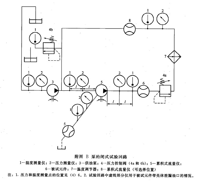 b. 液壓泵試驗回路。應(yīng)采用附圖A所示的開式試驗回路或附圖B所示的閉式試驗回路。如果要求泵的進油為壓力供油,應(yīng)在泵的進油管路中安裝一個壓力控制閥,其安裝位置距離壓力測量點不小于10d。