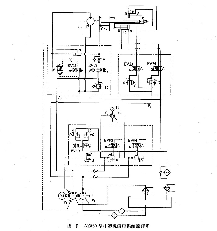 AZ560型注塑機由兩個獨立工作的注塑機和一個搭載16套模具的旋轉(zhuǎn)工作臺組成。一臺注塑機注鞋面,另一臺注塑機注鞋底。旋轉(zhuǎn)工作臺每旋轉(zhuǎn)一周就生產(chǎn)出16雙仿皮靴。注塑機的液壓泵采用力士樂V4變量雙聯(lián)葉片泵,其中一個為F型控制方式,另一個為C型控制方式。F型控制方式能進行流量、壓力復合控制,C型控制方式是帶手動壓力調(diào)節(jié)的恒壓控制。