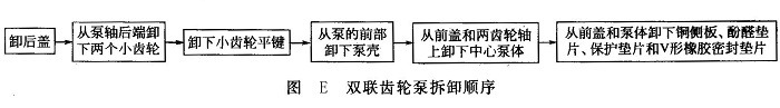 ⑤拆卸液壓泵時(shí),先用專(zhuān)用工具取下8個(gè)螺栓,再用木棒敲擊轉(zhuǎn)動(dòng)軸軸頭,便可分解齒輪泵。注意撞擊主動(dòng)軸時(shí)不要用力過(guò)大,輕輕敲擊,多敲幾次。拆卸順序如圖E所示。